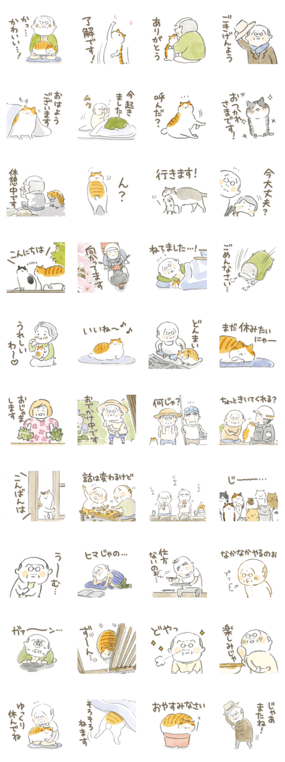 ねこまき本、ねことじいちゃん1巻からのキャラクタースタンプです。ねことじいちゃんの世界にようこそ!にゃー。
