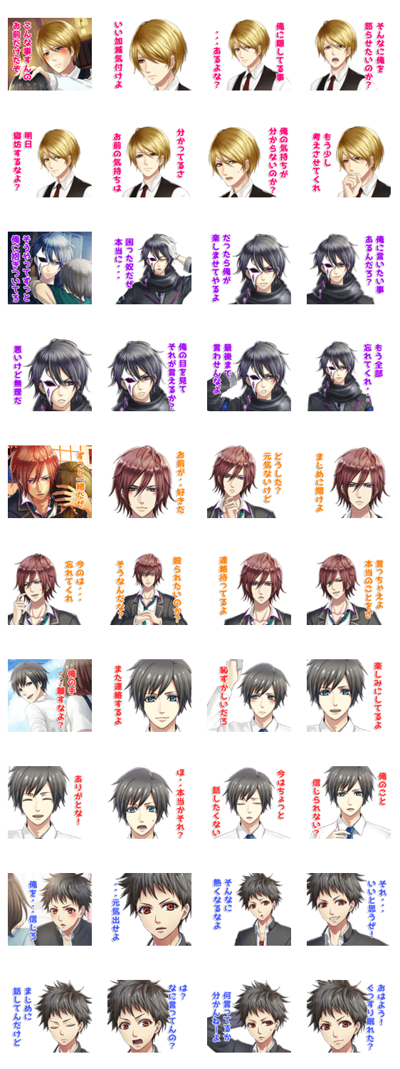 | スタンプ説明 | 俺様なイケメンたちの繰り出す恋愛トークのスタンプです。イケメン好きのM系女子は、上から目線のセリフにキュンキュンしちゃって下さい。男性もぜひ上手にご活用下さい。 |