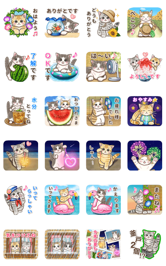 やさしい猫の夏のポップアップスタンプです♪毎日使いやすい言葉から“にゃつ”全開なものまでたくさん♫暑い夏もやさしい猫たちが元気をお届けいたします☆