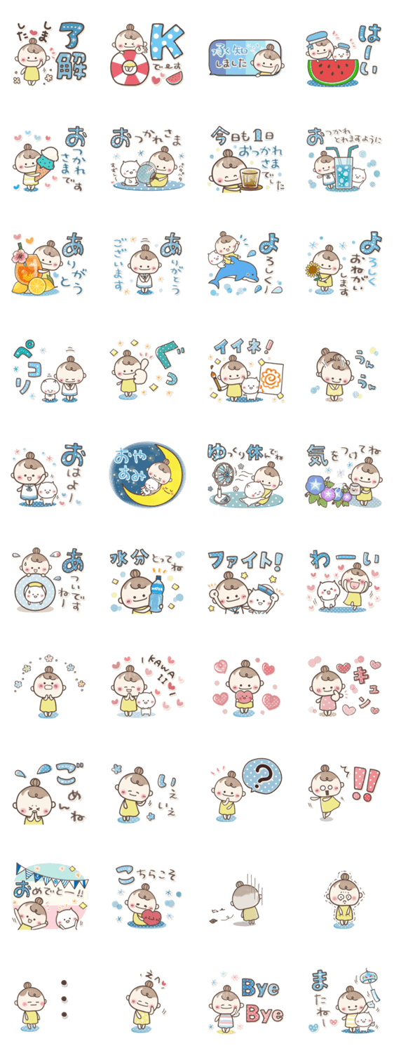 おだんご頭の女の子の夏の毎日に使えるスタンプです。よく使う言葉を集めた便利なスタンプです♪時々ネコさんも一緒にいます。