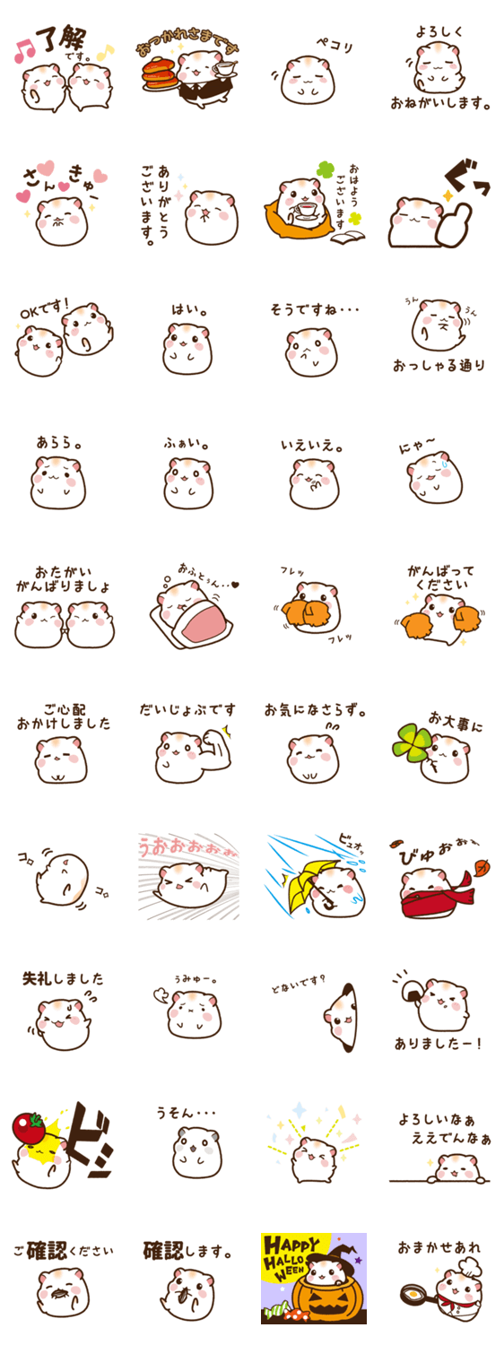 | スタンプ説明 | いつだってハムスターに会いたい。 日常会話・あいまい語多め。 かわいいハムスターのスタンプです。 |