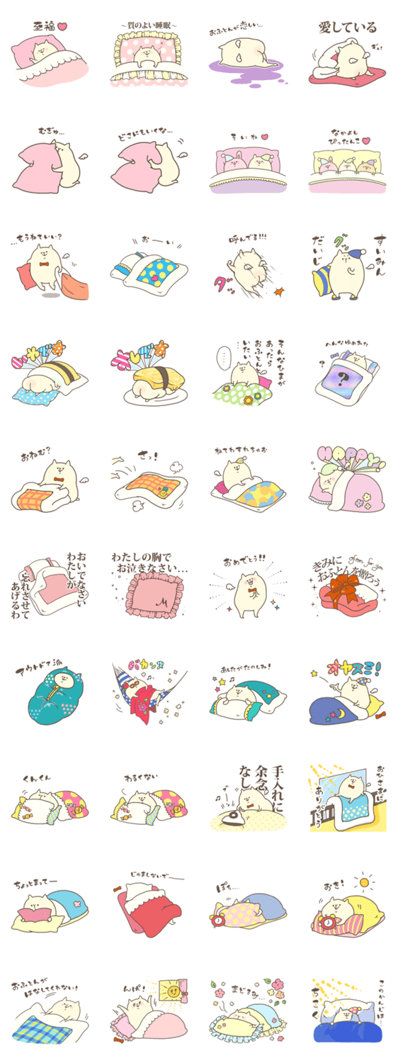 | スタンプ説明 | しあわせはこぶハッピーの妖精、ハッピーの申し子、申し子ちゃん! うれしいときもかなしいときも おふとんといればまいにちハッピー!ふわふわあったかおふとんだいすき! |