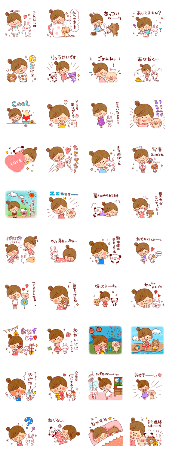 女の子とクマ・パンダ・うさぎ・ブタ・ネコや動物達の夏にピッタリなスタンプ♪優しいふんわりテイストで書いてみたよ♪★グラフィックデザイナー【たかせゆづき】スタンプ