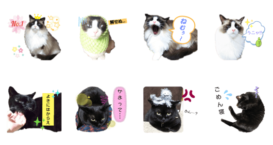 スタンプ説明 黒猫ボンベイと、たぬこなラグドールの楽しい日常。
