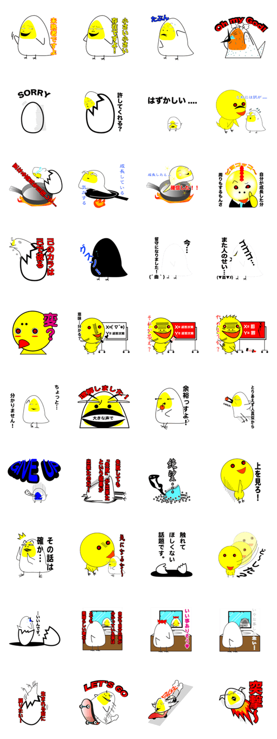 | スタンプ説明 | 目玉焼きをイメージした未熟児ヒヨコとちょっと目の怖いヒヨコのスタンプを作りました。落ち込んだ時や励ましたいとき会話の代わりに使っていただけたらと思います。 |