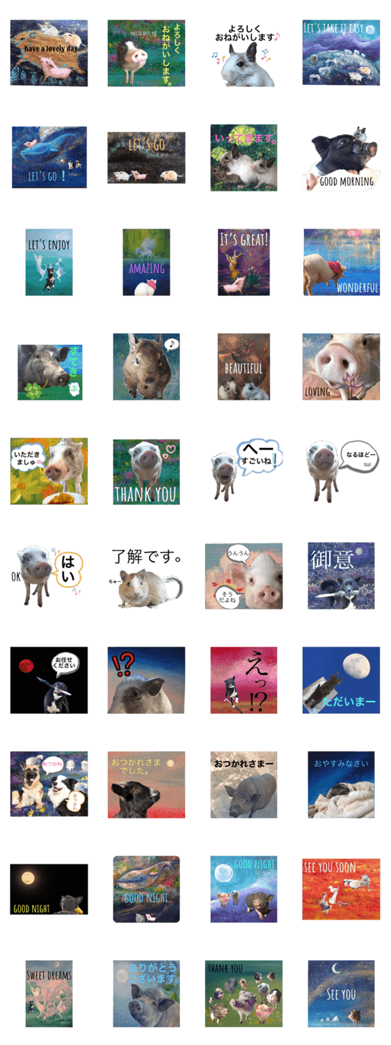 | スタンプ説明 | 豆金豚牧場のなかまたち、第6弾のオリジナルスタンプです。背景は同じく私、ミウラ•リョーコの絵画をコラージュしました。どうぞ宜しくお願いします。 |