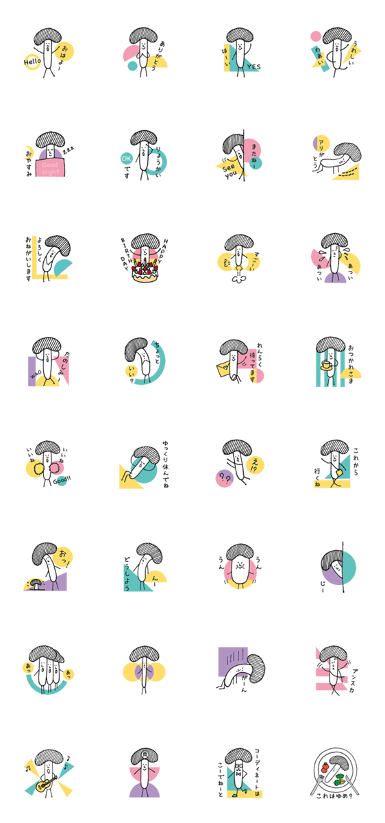 シンプルなきのこちゃんの日常使えるスタンプです♪普段にも毎日使えます♪北欧風/かわいい/癒し/シュール/カラフル/しいたけ
