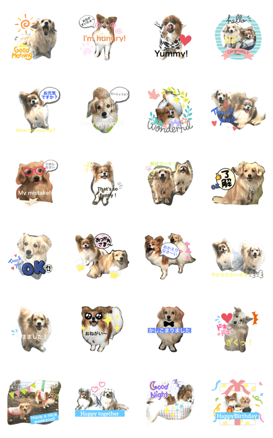 | スタンプ説明 | 甘えん坊のポメックスの大ちゃんとツンデレパピヨンの福ちゃんのスタンプだよ! |