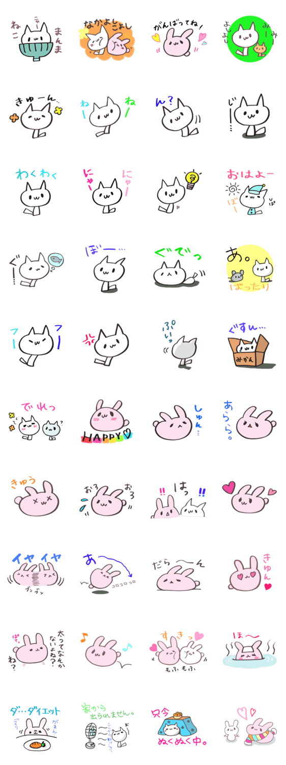手足のないキュートなうさぎと気まぐれにゃんこのマーカー手書きスタンプ♪ちょっとした表情の違いで、今の気持ちや微妙なニュアンスを伝えてくれます!