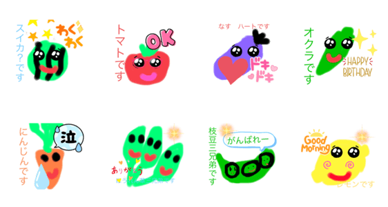 LINEスタンプメーカーでつくったスタンプです。初めてスタンプを作りました。野菜をイメージしでつくってみました。野菜くんは、いろいろ個性があります。つかってください