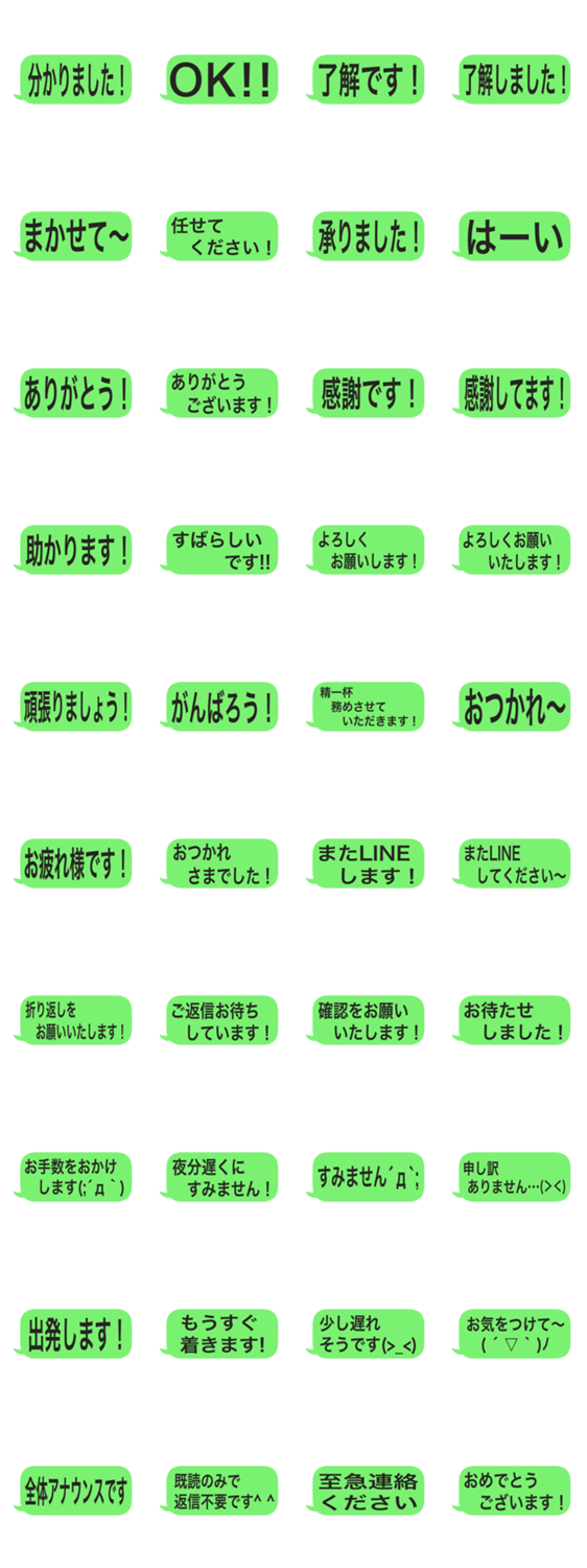 シンプルに文字と顔文字だけで仕上げた吹き出しスタンプ!業務連絡に使えそうな真面目系ラインナップ。通常の半分サイズで画面を圧迫しない!キャラ苦手な方、男性にも!
