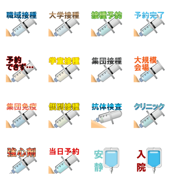 病院のワクチン接種の注射器や血液検査キット、点滴などのアニメです。医療や看護のステッカーです。医者や研究者から一般人にまで。
