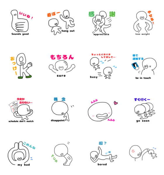 日常の挨拶や返事。使いやすい言葉をプチ英語とともにお送りするくちびる棒人間のスタンプです。