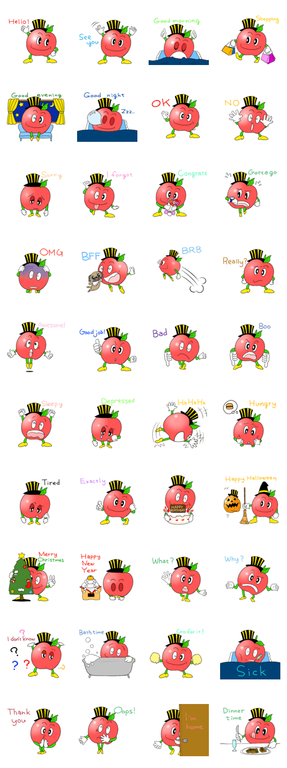| スタンプ説明 | Apple-kun goes to English school and he can tell you what words to use for the each situation. |