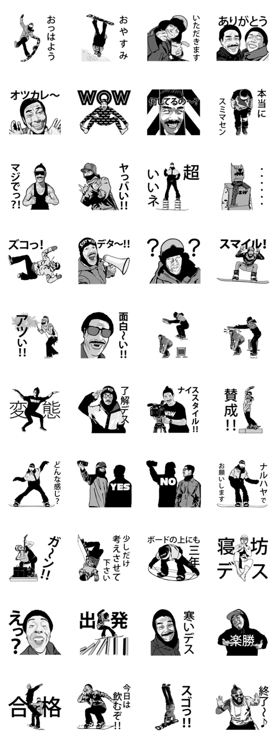 | スタンプ説明 | WOWのメンバーがあなたの日常にお邪魔しますスノーボードにお出かけの際は役に立つか分かりませんが宜しくお願いします |