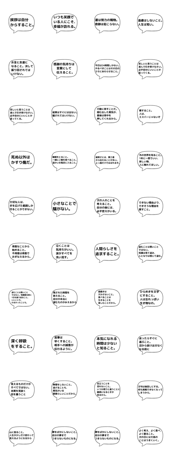 | スタンプ説明 | 作文 豊か 言葉 名言 人生 日常 吹き出し 返信 簡単 シンプル 励まし 落ち込む 元気づける テンション 夢 応援 声援 フレーズ 面白連絡 |