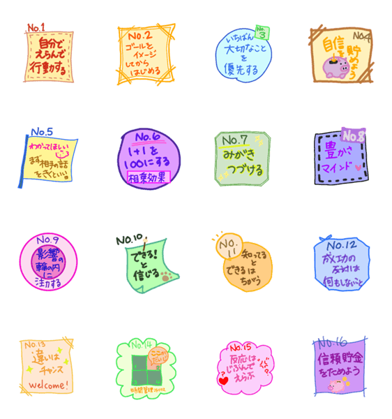 | スタンプ説明 | 7つの習慣で身につけたいパラダイムや 原理原則をスタンプにしました。悩んだときにハッとする、解決のヒントになるフレーズです。 |