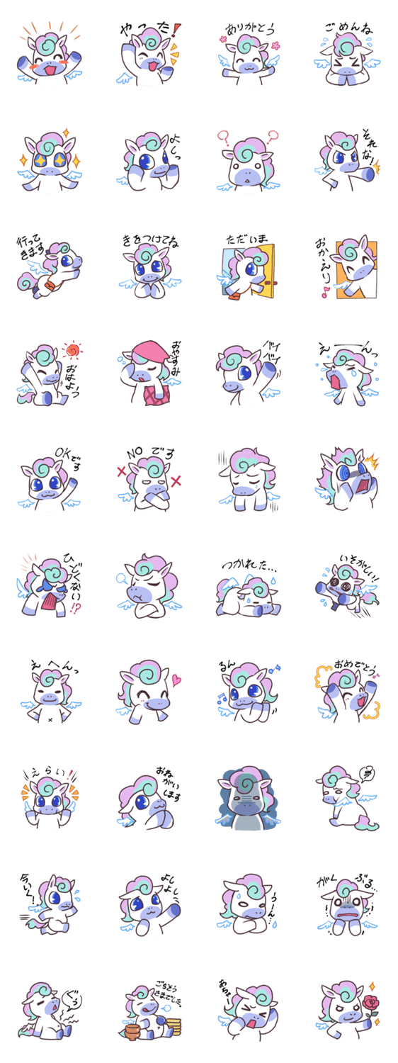 表情ゆたかなペガサスくんのスタンプです。定番からちょっと変わり種なものも。