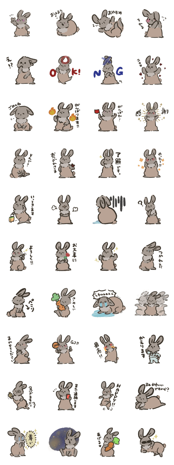 カフェラテ色のうさぎが元気いっぱいなスタンプです。