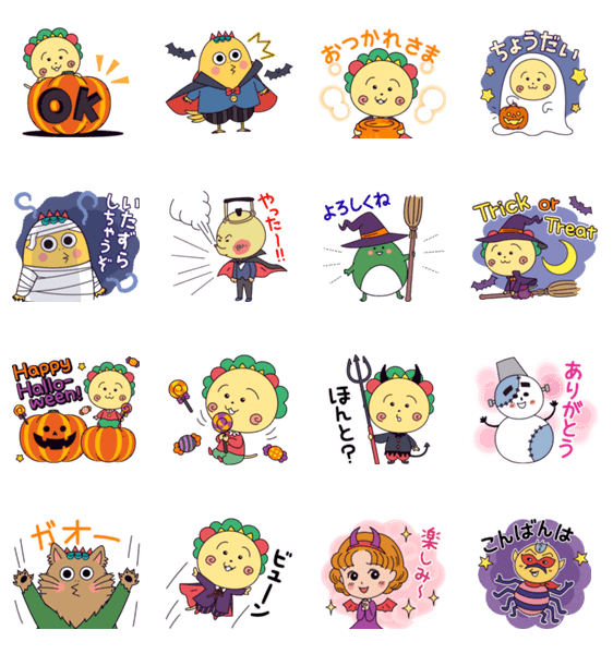| スタンプ説明 | コジコジの楽しいハロウィンスタンプが登場。魔法使い、ドラキュラ、ミイラ男…!仮装したコジコジやメルヘンの国の仲間たちと一緒にHappy Halloween! |