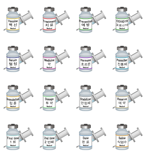 ワクチンや治療薬などを入れる注射器やボトルをデザインしました。英語と韓国語で記載しています。