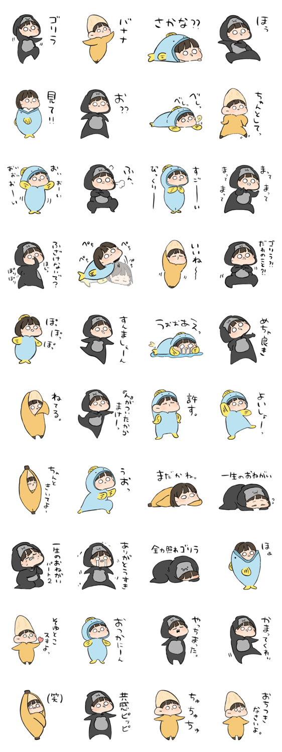 ゴリラとバナナとさかなのスタンプです。ゴリラ多めです。
