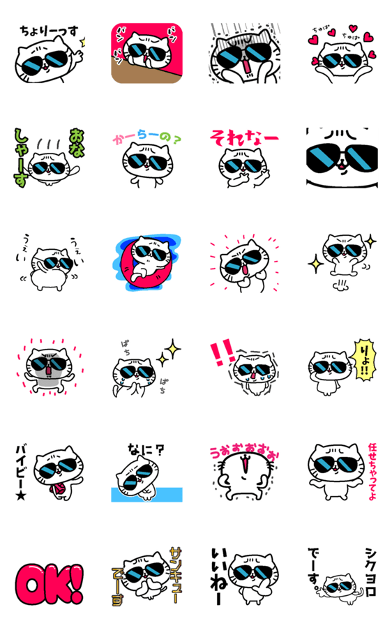 気難しいねこから人気のチャラ猫がアニメーションになって登場! 猫/ちょりーっす/バイビー/りょ/いいね/サンキュー/いい波のってんね/シクヨロ/かーらーの?/おなしゃす