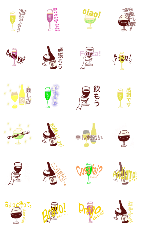 陽気でちょっとイタリアンな会話をワインとともに語れるスタンプです。