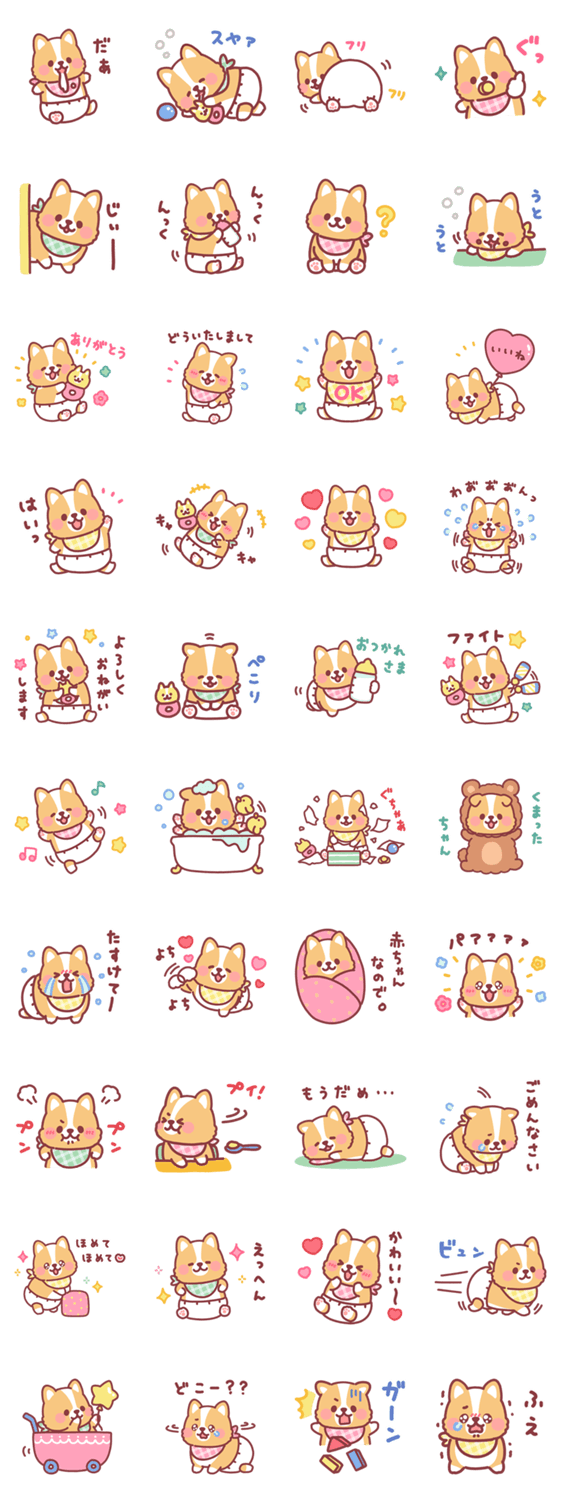 まるまるコーギーの赤ちゃんスタンプが出ました!コーギーパピーの毎日使えるスタンプです。あかちゃんがいるパパママ家族のやり取りにも、まだ赤ちゃんなあなたにも!
