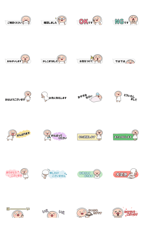 | スタンプ説明 | ビジネスにも使える丁寧な敬語のスタンプです。 本文を邪魔しない省スペースタイプ。 |