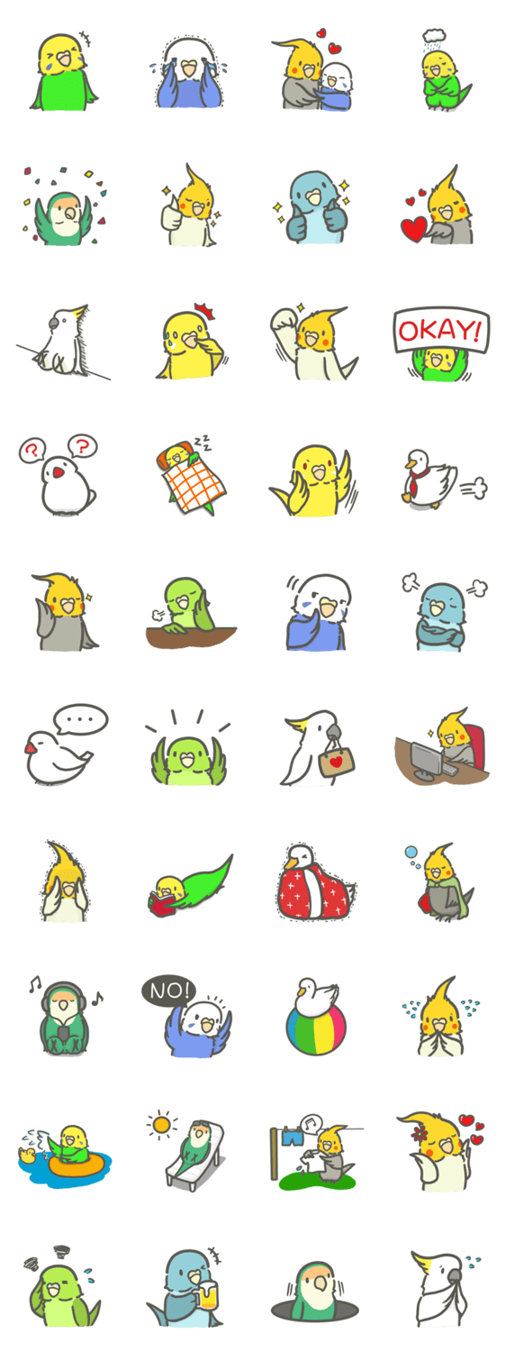 可愛い鳥たちのデフォルト風スタンプ。セキセイ・オカメイ・マメルリハ・文鳥・アヒルなどなど。