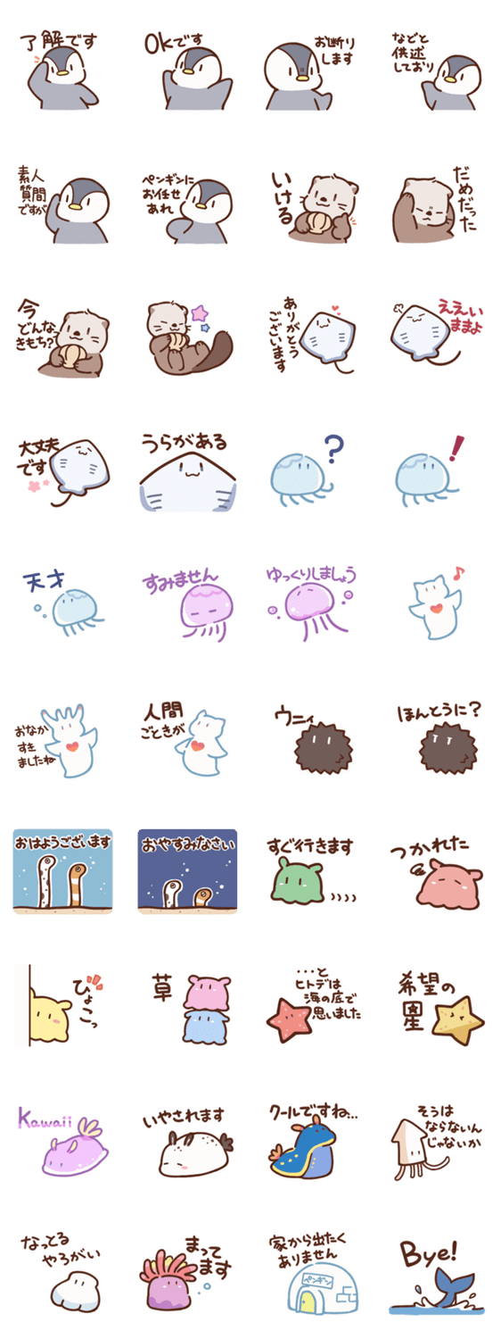 いつかどこかの海にいるいきものたちの、ゆるくてちょっとシュールなスタンプです。