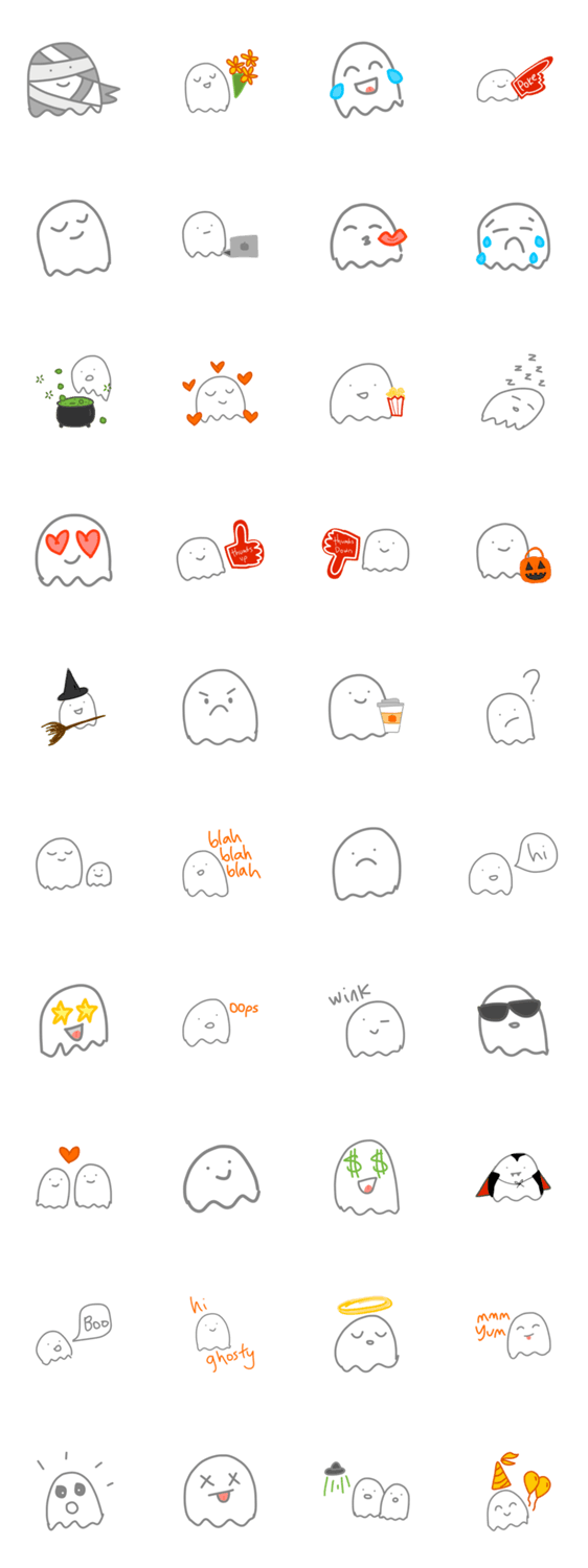 Hand illustrated cute ghost stickers are perfect for halloween but also all year round! 40 stickers to choose from for your messages!