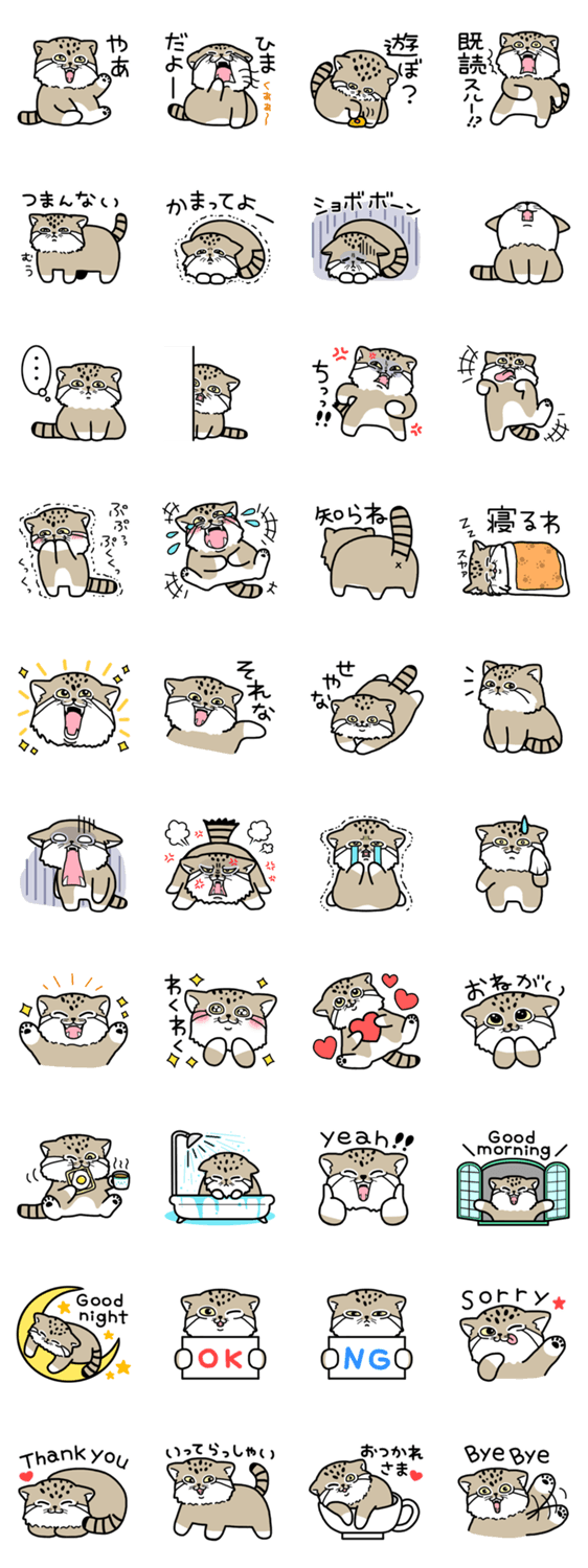 ずんぐりむっくりなもふもふボディに愛嬌のある表情が特徴のマヌルネコさんのスタンプです