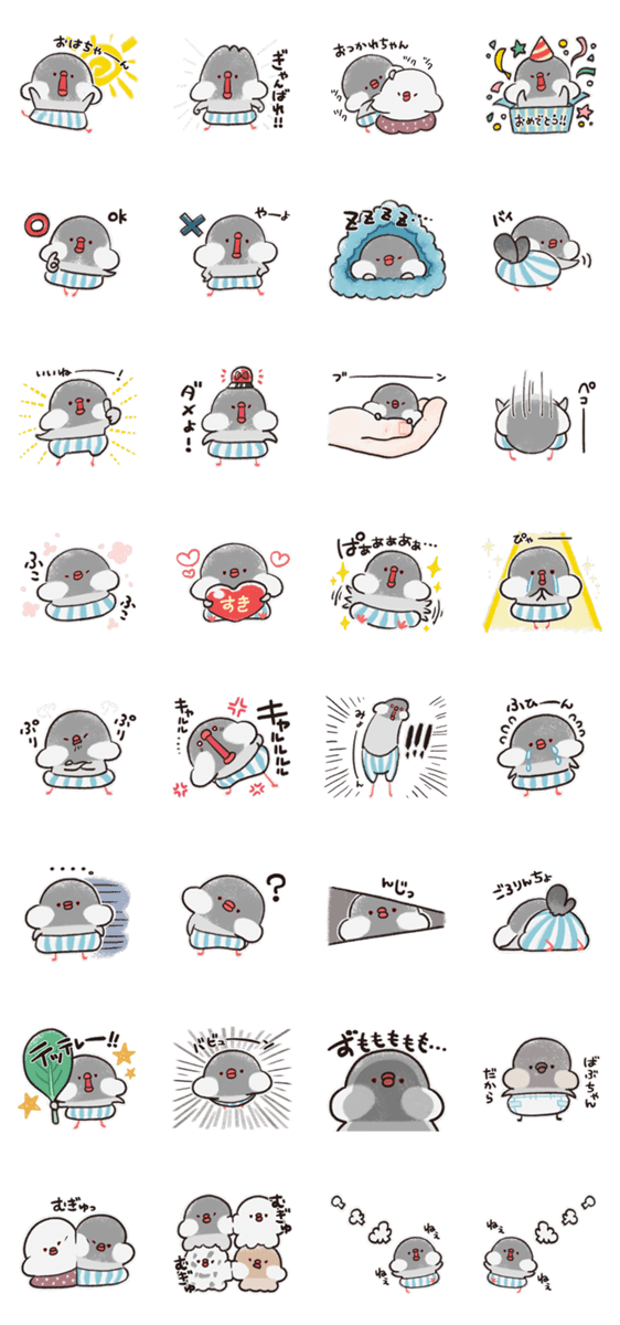 パンツを履いたかわいい文鳥のスタンプです。 挨拶や返事、感情表現など基本的なセット+遊び心。