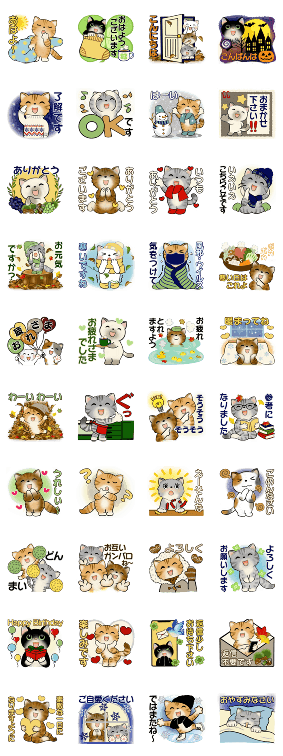 秋冬の毎日に使える心温まる猫さん達の敬語入りのスタンプです。 秋から冬にかけて長く使えます。 今日も笑顔で過ごせますように。
