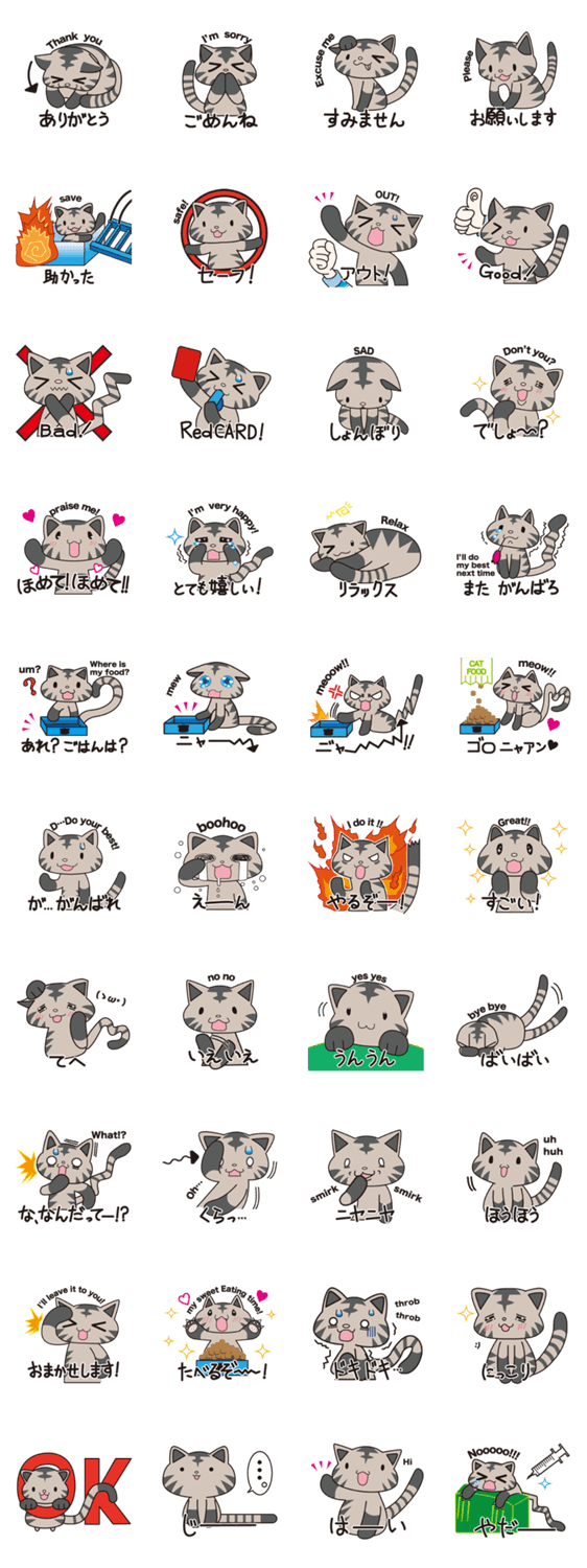 飼い猫ミーちゃんをモデルにスタンプをつくりました。友人や家族との雑談に使えます。英語も入っているので、英語圏の人とのやり取りにも使えるかも!?