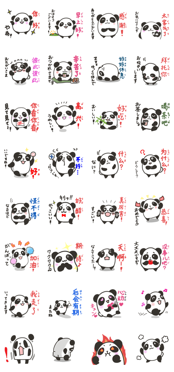 かわいいパンダのシンプルなメッセージスタンプです。中国語の読みがなと日本語の対訳つき。中国語学習の方にもどうぞ。