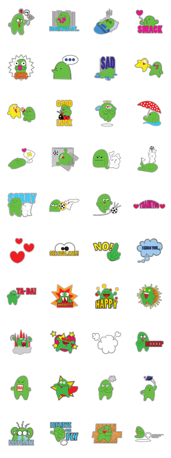 | スタンプ説明 | Famous Mr Blub is a green puppy who is very emotional. He has a friend called Mr Ears and a girl friend called Rock Star. Have fun with his sticker collection! |