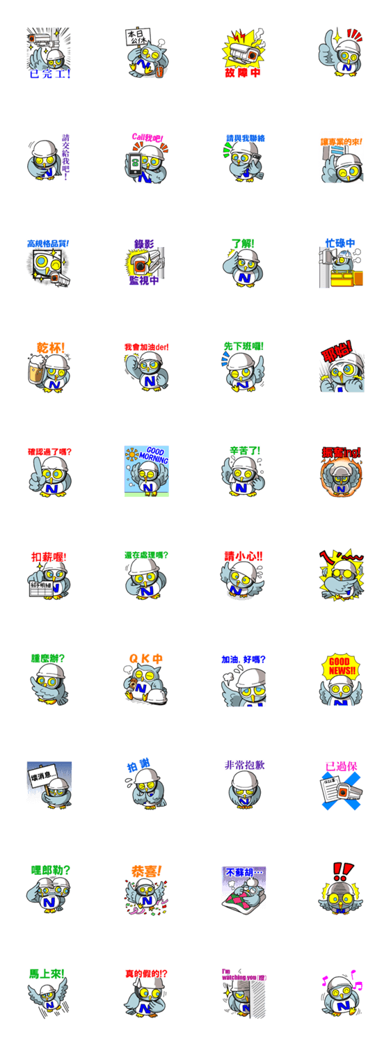 | スタンプ説明 | This sticker is for all installers to comunicate quickly! Quick reply, Quick responce. Happy Owl is always busy. His name is NEX. |