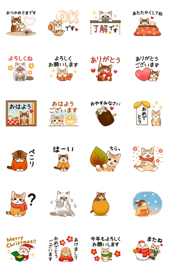 ねこたちの動くスタンプです。秋・冬に使いやすいものが多めのセットです。クリスマスやお正月にも。(日常・挨拶・敬語)