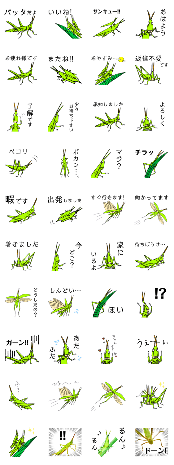 ショウリョウバッタのバタ吉と、オンブバッタのオブとバタです。実写スタンプを3個入れておきました。昆虫を好きなアナタへ。