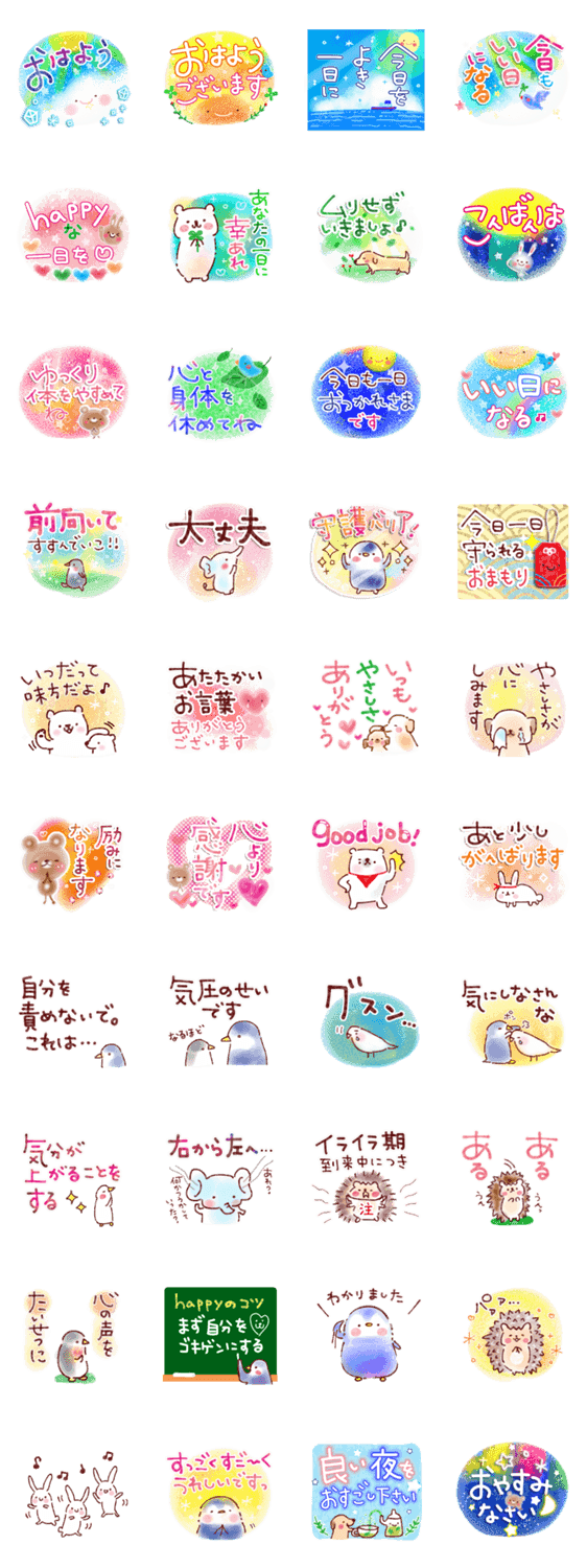 前向きに生きるスタンプの第三弾です。 心がほっとする・やさしさをお届け。大切な人・自分にも、エールとちょっぴりユーモアを♪日常挨拶も入っています。