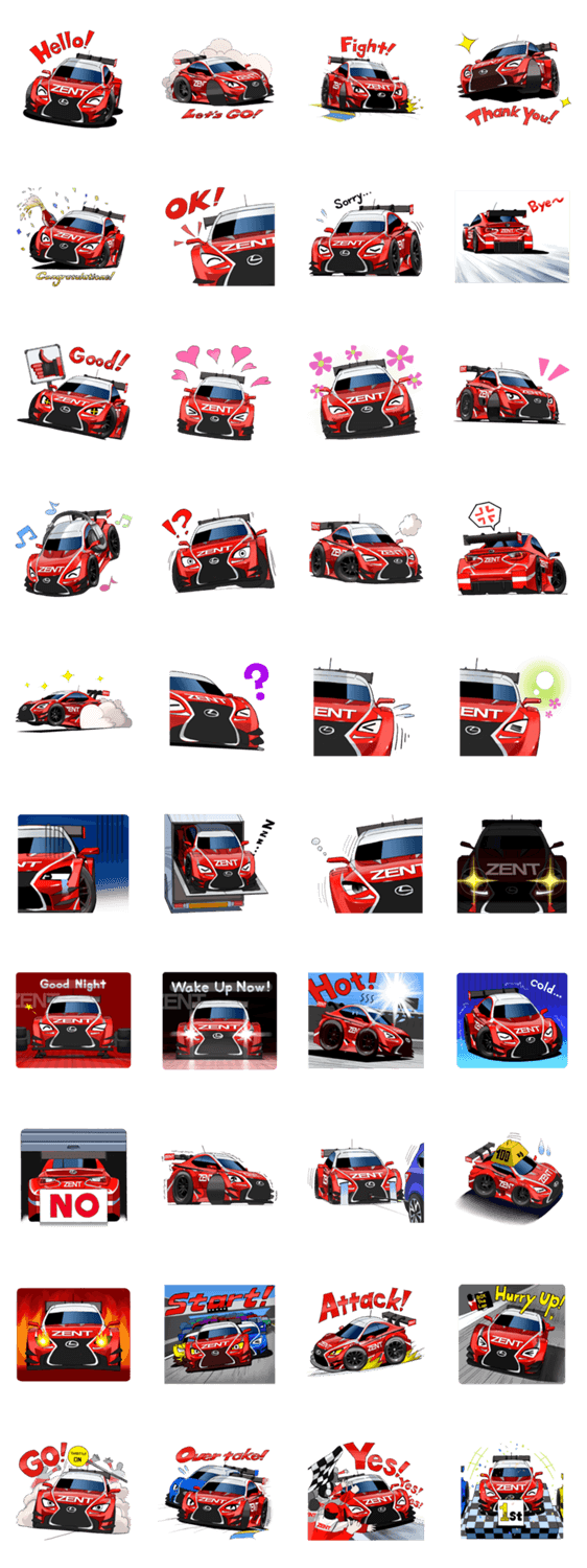 | スタンプ説明 | SUPERGT 500クラスに参戦する「LEXUS TEAM ZENT CERUMO」のレース参戦車両「LEXUS RC-F」をモチーフとしたLINEスタンプが登場! |