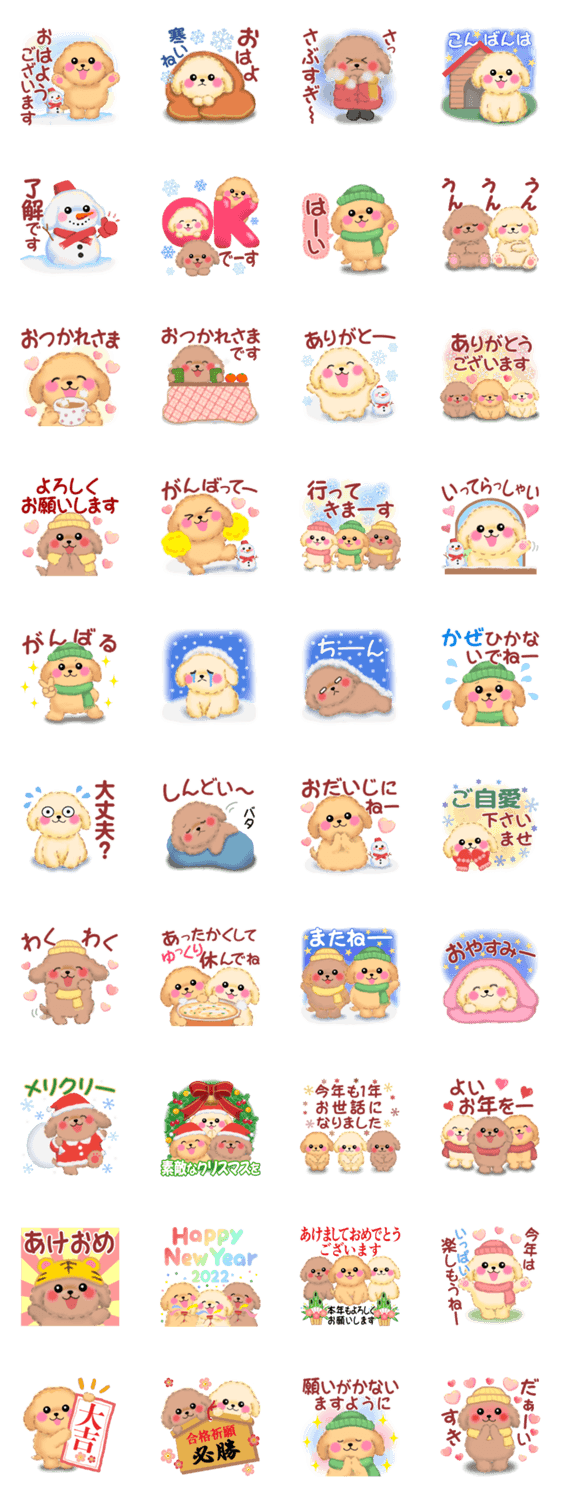クリスマス、お正月など…冬に活躍する「かわいいトイプードル」のスタンプです。