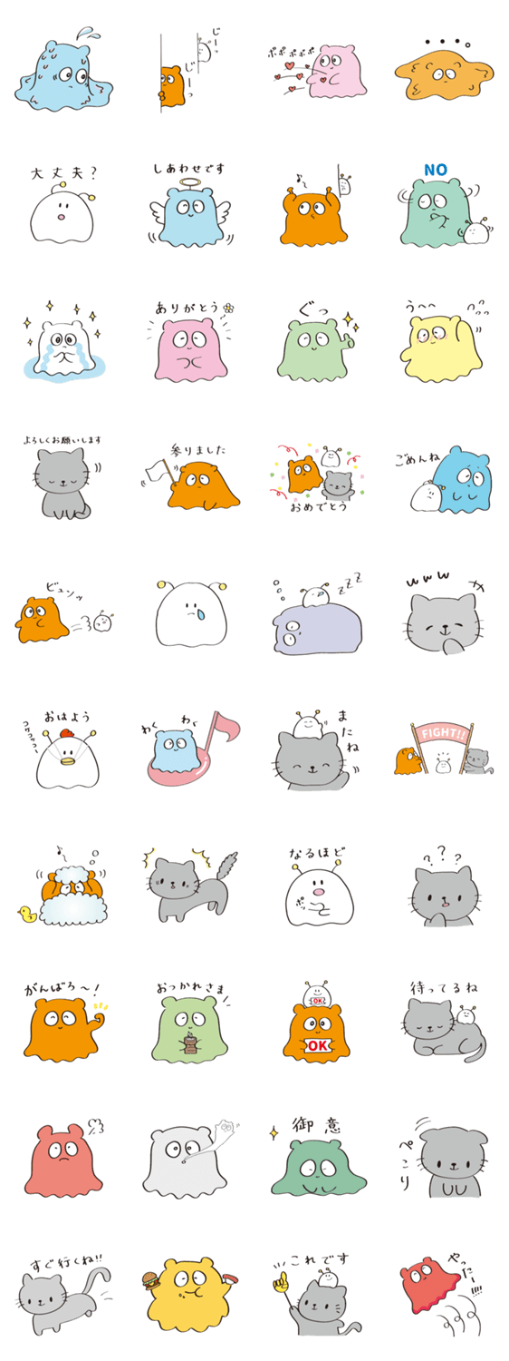ポピーとなかまたちのスタンプです。名前はポピー、ムー、ねこさんです。※ポピーは気分によって色が変わります。