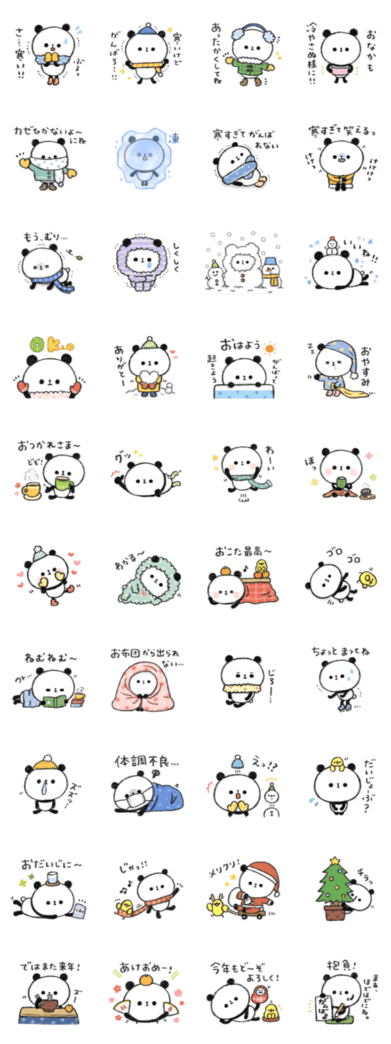 だらだらっとした、ゆるーいパンダの冬スタンプ。クリスマス、お正月にも!