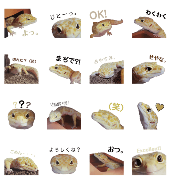 | スタンプ説明 | ヒョウモントカゲモドキ(レオパードゲッコー)のおとこのこ・ひなたくんの使いやすいスタンプセット。慣れたら喋る方です。仲良くしてね。 |