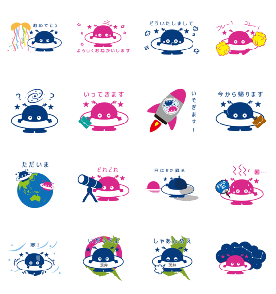 | スタンプ説明 | 1985年につくばで開催された国際科学万博の公式キャラクター「コスモ星丸」のスタンプ第2弾。普段使いしやすいものから茨城弁のスタンプまで登場です! |