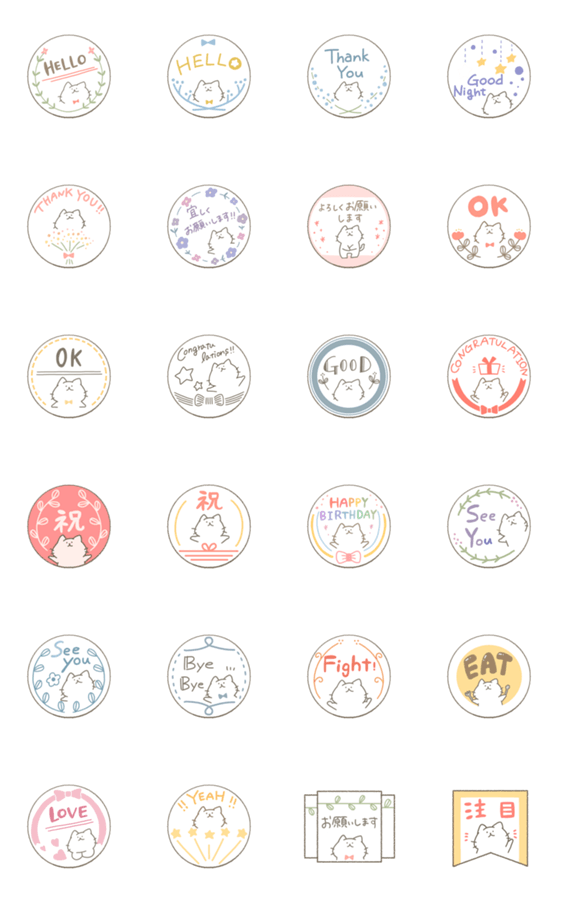 可愛い猫の動くロゴステッカー風スタンプです。挨拶、イベント、日常会話で使えるカラフルデザイン。